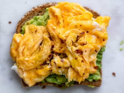 برای درست کردن تخم مرغ همزده با تست آووکادو باید آووکادو را له کرده با نمک و فلفل طعمدار کنید و سپس آن را روی نان برشته بمالید.