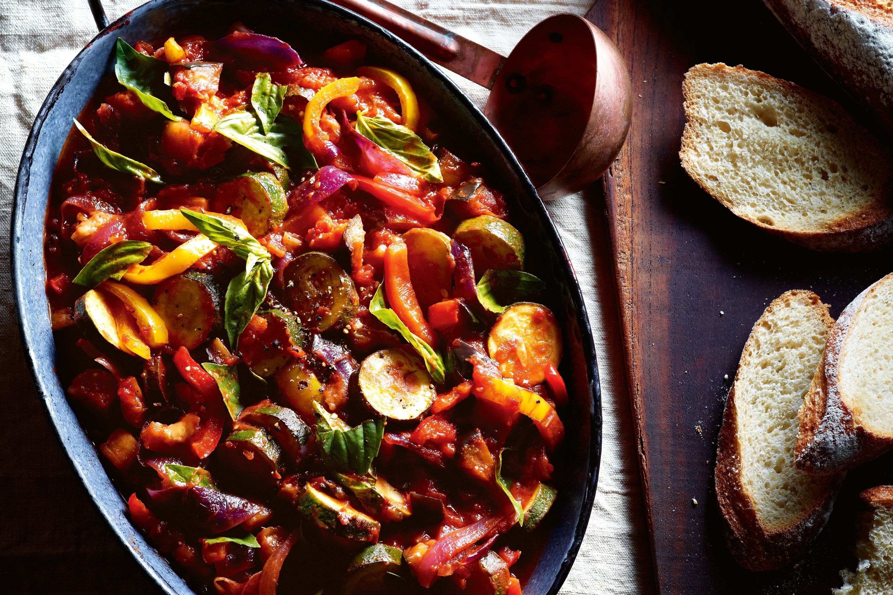کدو، پیاز، سیر، گوجه فرنگی و سیب زمینی را خرد کنید و به همراه بادمجان داخل قابلمه بریزید.آب را به مواد درون قابلمه اضافه کنید و آن را روی حرارت کم قرار دهید. صبر کنید تا آب درون قابلمه بجوشد و مواد کاملا پخته شوند.