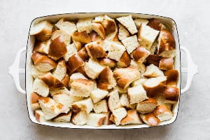 نان خرد شده در اندازه‌های مساوی را در ظرفی که از قبل با کره چرب کرده‌اید به طور یکنواخت پخش کنید.