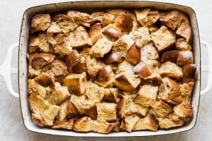 مخلوط به‌دست‌آمده را روی نان‌ها بریزید و ظرفی که قرار است برای فرنچ پرس خود استفاده کنید را در طبقه وسط فر به مدت ۴۵ دقیقه بگذارید تا کاملا پخته شود. البته این زمان نسبی است و به فر شما بستگی دارد. بنابراین، توصیه می‌کنیم فر را هر 10 دقیقه چک کنید تا در اثر حرارت زیاد نان‌های تست نسوزند.