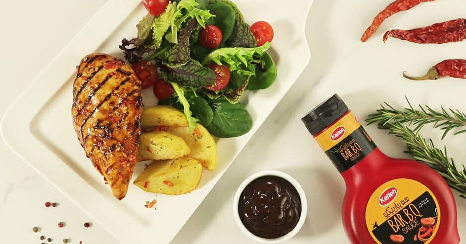 فلفل قرمز خشک را خرد کنید و حین گریل کردن، روی مرغ بریزید. طرف دیگر مرغ را هم گریل کنید. مرغ باربیکیو آماده است. کنار مرغ، سیب زمینی آب پز شده، مقداری سبزیجات و گوجه گیلاسی و سس باربیکیو کاله آماده کرده و در ظرف مناسب سرو کنید.